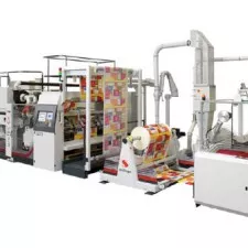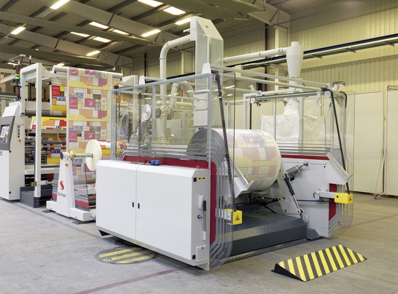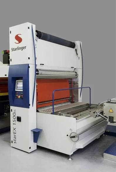 Lamination sur tissus PP ou PEhd jusqu'à 1.500 mm de large avec changement de rouleau automatique.